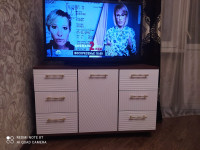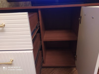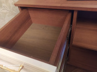 Высокие устойчивые ножки (8 см) придают конструкции воздушность и облегчают уборку под ней. Под просторной столешницей удобно разместить телевизор, декор или бытовую технику, а шесть выдвижных ящиков и распашной отсек с полкой обеспечат удобное хранение всего необходимого.