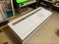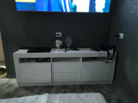По краям расположены две распашные дверцы, за которыми находятся вместительные отделения для хранения техники, кабелей, документов и других необходимых мелочей. В центральной части предусмотрены два выдвижных ящика, удобных для размещения пультов, зарядных устройств, игровых аксессуаров и прочих вещей, которые важно держать под рукой. Верхняя открытая ниша подойдет для декора, книг или мультимедийной техники.