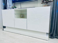 По бокам расположены две распашные дверцы, за которыми находятся вместительные отделения с полками для хранения приставок, документов, кабелей и других необходимых мелочей. В центральной части предусмотрена откидная дверца, а над ней расположена открытая ниша со стеклянной полкой. Такое решение делает тумбу не только удобной в использовании, но и визуально более легкой. На открытой полке можно разместить декор, книги или мультимедийные устройства.