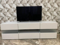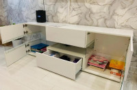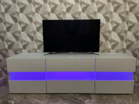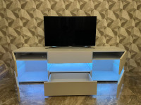За фасадами расположены удобные секции для хранения техники, аксессуаров, документов и декоративных предметов. Провода можно аккуратно скрыть за задней панелью, чтобы телевизионная зона выглядела аккуратно и организованно. При необходимости тумбу можно дополнить стеклянными или деревянными полками, а также выбрать подходящие размеры, цветовое исполнение и вариант фурнитуры.